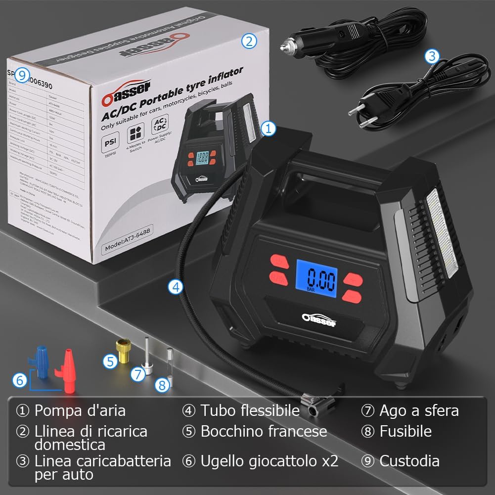 5.Abundant accessories: French conversion nozzle, toy nozzle x2, ball needle, oasser portable air compressor AC/DC has a handle, ergonomic and convenient to carry. NOTE: It is recommended to cool the inflator for oasser portable air compressor for 5-10 minutes every 8 minutes of operation. Prevents excessive temperature and gear wear caused by prolonged operation of the inflator.