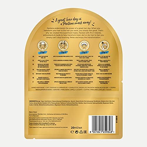 Pantene Pro-V Maschera CAPELLI LUCENTI che include una cuffia riutilizzabile dal design unico. Quando trasformi i tuoi capelli nei capelli che desideri, ti senti alla grande: per questo Pantene ha creato le maschere Multi-Nutrienti per capelli, arricchite con infuso Pro-V, antiossidanti e lipidi per aiutare a trasformare i capelli opachi, spenti in capelli brillanti e meravigliosi da toccare. Applica la maschera e rilassati per almeno 10 minuti.e goditi la trasformazione.