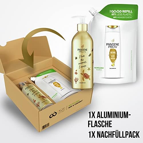 Lo shampoo Pantene Pro-V Rigenera e Protegge deterge delicatamente nutrendo i capelli grazie alle sostanze attive Pro-V. Ripara all’istante i segni del danneggiamento quali la rottura e la perdita di morbidezza e lucentezza. La sua formula ora è disponibile in bottiglie in alluminio ricaricabili (senza uso di plastica eccetto il dosatore) con un esclusivo design ispirato al prezioso ecosistema marino, ed una ricarica realizzata con il 60% in meno di plastica (per ml, rispetto ad un flacone standard di shampoo Pantene Pro-V). Questo KIT contiene una bottiglia riutilizzabile e una ricarica dello shampoo Pantene Pro-V. Per utilizzarla, ruota il dosatore in senso orario (leggi le istruzioni sul dosatore). Una volta usata la bottiglia, puliscila, asciugala e ricaricala con shampoo Pantene Pro-V. Questo nuovissimo starter kit Pantene Pro-V è disponibile in una scatola di cartone riciclata e riciclabile. Per ottenere i migliori risultati, usalo insieme al balsamo e ai trattamenti Pantene Pro-V Rigenera e Protegge.