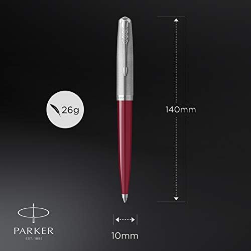 La penna presenta un prezioso e resistente corpo in resina borgogna lucido e un cappuccio con finiture in acciaio inossidabile e la caratteristica clip a freccia di Parker