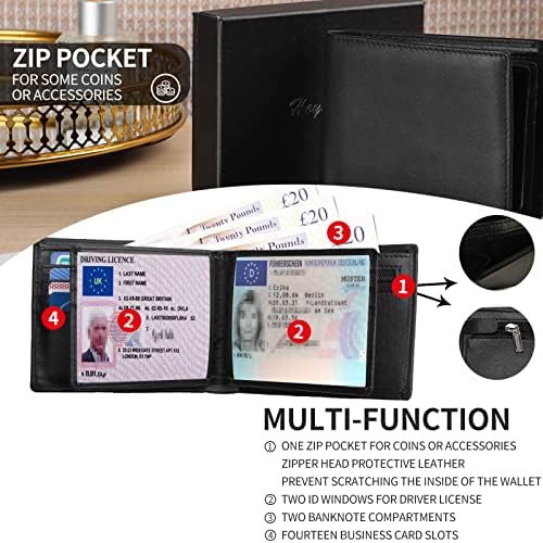 Questo portafogli uomo è più spazioso, è composto da 2 finestrelle per carta d’identità, 1 portamonete a cerniera, 14 scomparti per carte e 2 per banconote. Puoi conservare facilmente tutto quello che ti serve in questo portafoglio e portamonete.