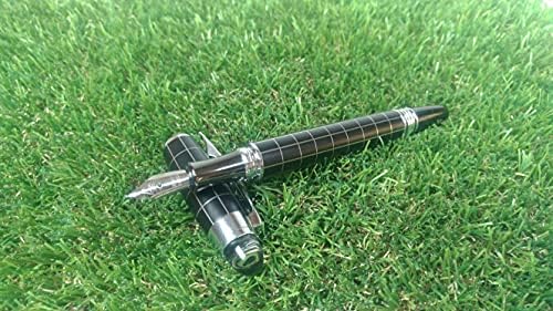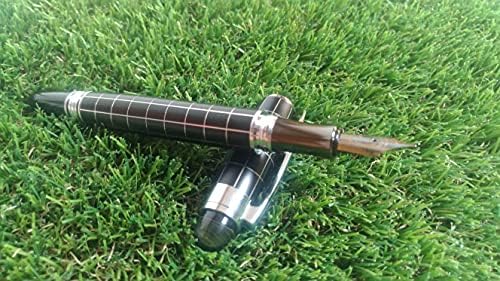 Penna punta sottile con un design classico e innovativo, chiusura con cappuccio girevole con decorazione di dettaglio traslucido, corpo nero con stampa a quadri con anello rivestito argento e parte inferiore cromata marrone.