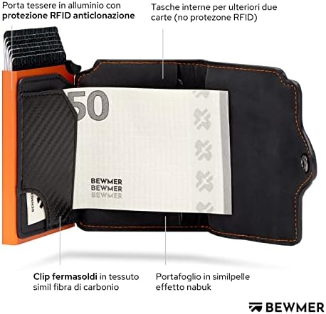 Sei indeciso su quale porta carte di credito fa al caso tuo? Vuoi fare un regalo ma hai paura di sbagliare?Ti capiamo! Nel 2021 c’è molta varietà e la scelta diventa sempre piu’ difficile!Perchè dovresti scegliere il porta carte di credito Bewmer ?Perchè abbiamo pensato ad ogni minimo particolare per renderlo perfetto, per te o per farti fare bella figura!Bewmer è un Marchio Italiano di porta carte di credito, elegante e di alto design ideato per chi vuole avere tutto in un unico posto, senza correre rischi.✔ ALL-IN-ONE !!Con le rivoluzionarie dimensioni –> 10 x 7 x 2,1 cm il nostro porta carte rappresenta una sfida alla fisica. All’interno potrà contenere fino a 8 carte e 10 banconote!! ✔ ELEGANTE E SICUROIl nostro innovativo sistema pop-up, permette alle tue carte di uscire dal case in alluminio con estrema facilità. Inoltre, è stato progettato per evitare la caduta accidentali delle carte.✔ PROTEZIONE – Lo sapevi che.. ????!!!..Con l’avvento dei sistemi contactless, i ladri del 3 millennio hanno strumenti per clonare ed asportare soldi dalle carte semplicemente avvicinandosi al tuo portafogli.Il portacarte Bewmer è dotato di sistema di protezione da questi attacchi, garantendo totale sicurezza e tranquillità!✔ MULTIUSOGrazie al suo design, e’ ottimo per essere utilizzato tutti i giorni, sia per uomo che per donna. Sia per un gala’ di sera che per situazioni informali o sportive.✔ OTTIMA IDEA REGALOGrazie a tutte le qualità che potrai toccare con mano, il nostro porta carte si presta anche per essere un regalo originale ed utile!