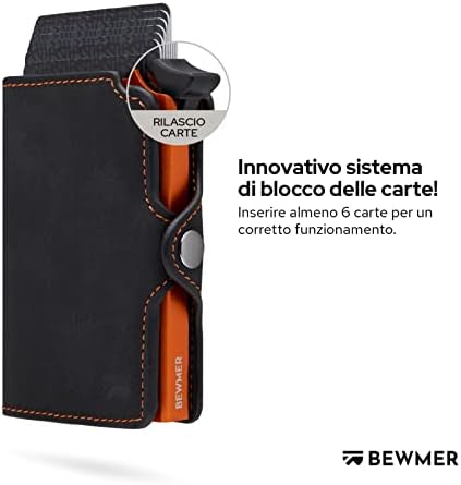[SICUREZZA] La protezione RFID / NFC mantiene al sicuro le tue carte contactless da clonazioni e altre truffe garantendoti un portafoglio schermato e anticlonazione. Inoltre la leva del sistema automatico di estrazione delle carte non permette la fuoriuscita accidentale delle carte di credito dal portafoglio