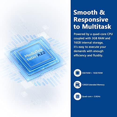 MediaTek A22 Processore Quad-core e l’ultimo sistema operativo Android 11 consentono di visualizzare messaggi importanti nel modo più semplice, gestire facilmente più applicazioni per proteggere la privacy. Attraverso 3 + 16GB, la memoria di espansione da 128GB garantisce che è possibile gestire facilmente più attività, avere abbastanza spazio per memorizzare le tue immagini, film, video, ecc.