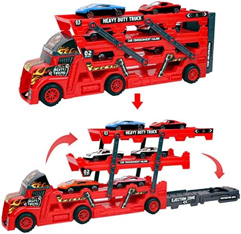 46CM Grande Camion Giocattolo: viene fornito con quattro livelli espandibili per i bambini per trasportare macchinine, dinosauri. Premendo il pulsante sul retro del camion, la mini macchina uscirà di corsa dallo scivolo.