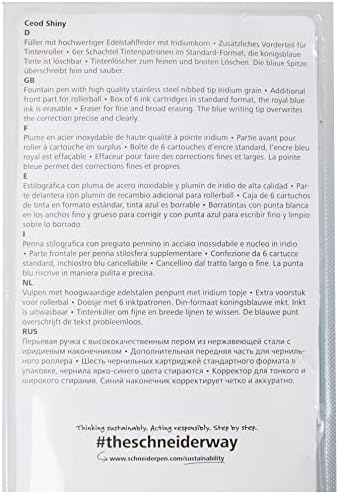 Il set include: 1 penna stilografica Ceod Shiny, 1 penna roller anteriore Ceod Shiny, 6 cartucce di inchiostro blu, 1 cancellino Corry