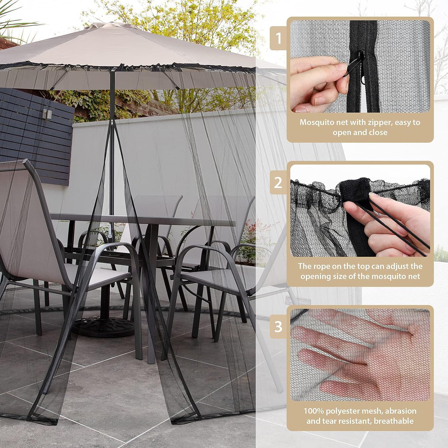 【RETE ROBUSTA】Rete in poliestere ad alta resistenza estensibile di alta qualità, diametro della maglia ≤ 1mm, può bloccare oltre il 99% delle zanzare e altri piccoli insetti. Goditi la vita nelle notti d’estate senza essere disturbato e morso da fastidiosi insetti! Sekey patio zanzariera ombrellone ha una doppia cerniera interna ed esterna. Le cerniere in metallo premium di alta qualità sono resistenti e facili da usare. Ti permettono di entrare e uscire liberamente, senza problemi.