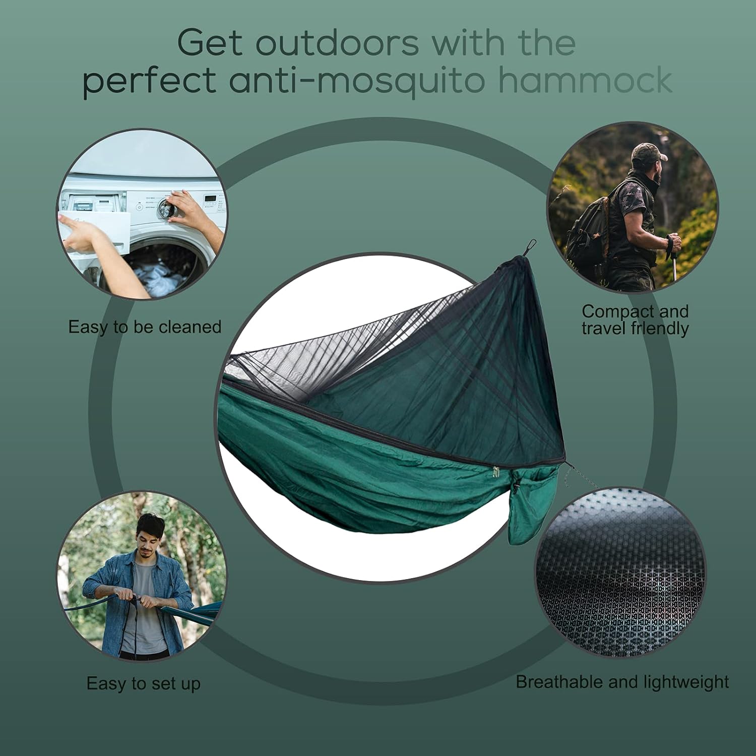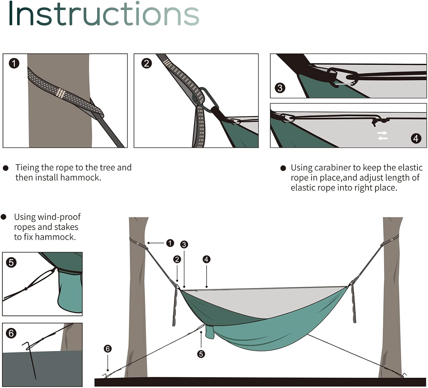 【Easy to Install】Our outdoor nylon hammock comes with 2 hammock straps, 2 carabiners and 2 6m ropes. You can simply attach them to something sturdy like trees, and it’s so quick to install in just a minute. The mosquito net zipper is two-way, you can easily close it even if you are inside the mosquito net.
