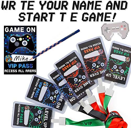Fornitura VIP Pass: pass VIP con gamepad e icona del videogioco stampato nella parte anteriore, pieno di atmosfera a tema party, e puoi scrivere informazioni personali nella parte posteriore.