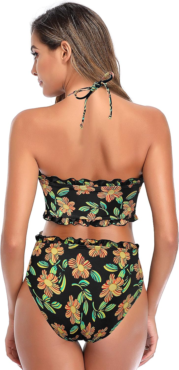 SHEKINI Bikini Imbottito Costume da Bagno Donna Bikini Bandeau Top Halter Regolabile Costumi Donna Due Pezzi Stampati con Bordo Arricciato Avvolgente Ruffle Trim
