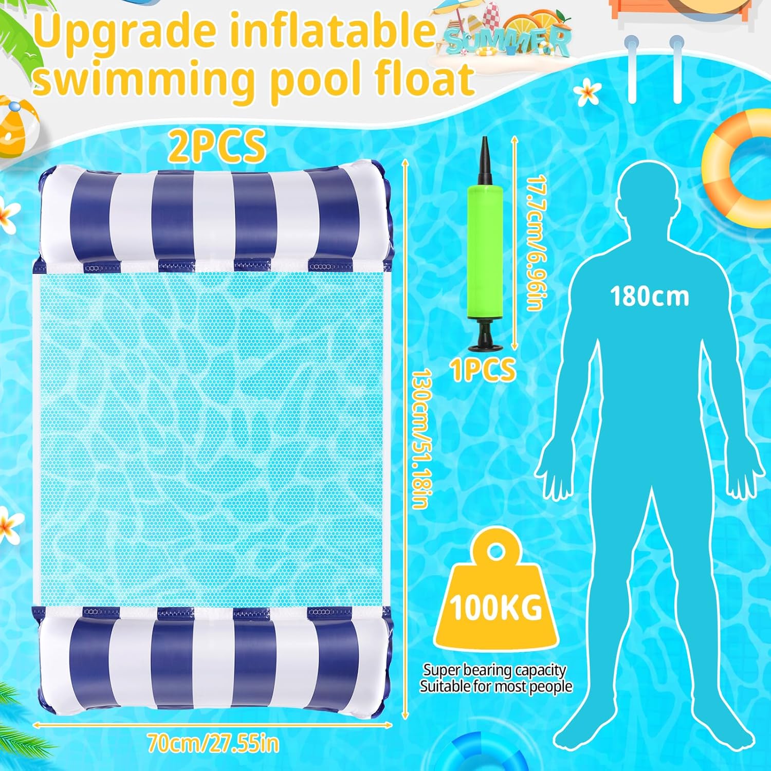 Swimming pool floats with hammock: 2 inflatable hammocks and 1 inflatable pump, Product expansion size: 130 x 70 cm, air mattress pool packing size 23 x 28 x 3.5, packing weight: 0.5 kg, lightweight, easy to fold. Suitable for adults, recommended for children to use under adult supervision. Ideal for outdoor pool parties, beaches, lakes and more
