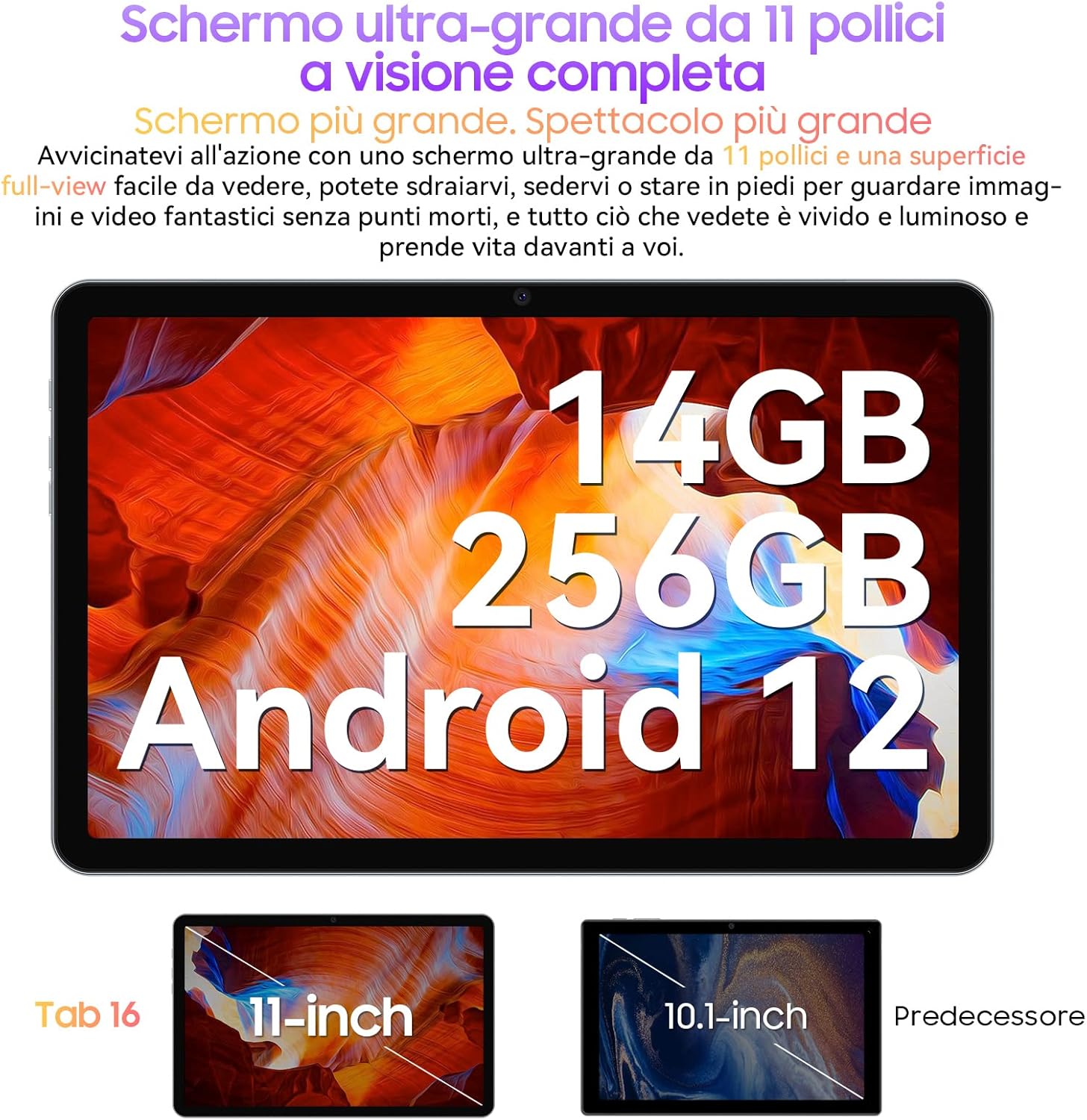 【𝟏𝟒(8+6)GB RAM & 𝟐𝟓𝟔GB & 𝟒𝐆 LTE + 𝟓𝐆 WIFI】Blackview Tab 16 tablet processore a 8 core e gli 8GB memoria espandibile fino a 14GB consentono un multitasking veloce e senza latenza.256GB ROM offrono spazio sufficiente per archiviare giochi, video, applicazioni e musica. (1TB TF Espandibile)Il Tab 16 è dotato di doppio slot SIM per rimanere connessi al lavoro o al gioco, anche in assenza di una connessione Wi-Fi. 5GWIFI garantisce una connessione rapida a Internet.