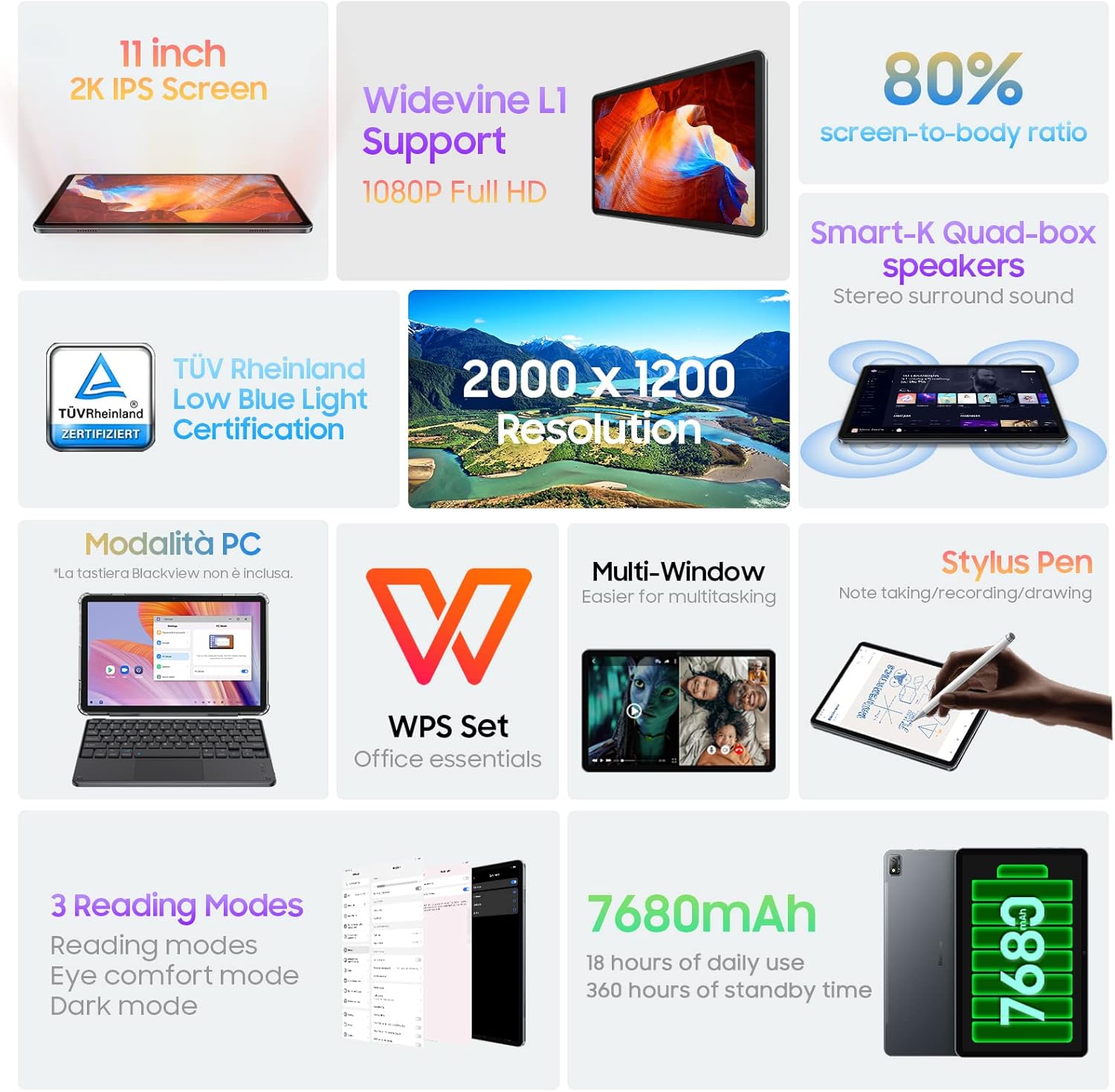 【Widevine L1/TÜV Certificazione+𝟐𝐊 Incell Schermo】Il tablet Blackview Tab 16 supporta Widevine L1 e consente di godere di un’esperienza visiva di qualità cinematografica su Disney+, Amazon Prime Video.(Netflix HD non supportato)Il Tab 16 è dotato di un enorme display Incell FHD+ 2K da 10,95″. La risoluzione 2K offre una riproduzione dettagliata dei colori.È certificato TÜV a bassa luminosità blu, per ridurre il rischio di affaticamento degli occhi dovuto alla visione prolungata dello schermo.