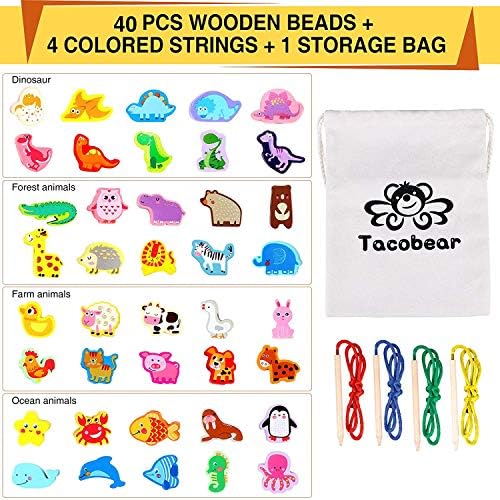 Le nostre perle allacciatura in legno set, comprende 40pcs colori brillanti perline, 4pcs stringhe, e un sacco di stoccaggio. Giocattoli Montessori in legno per bambini, un must per i più piccoli.
