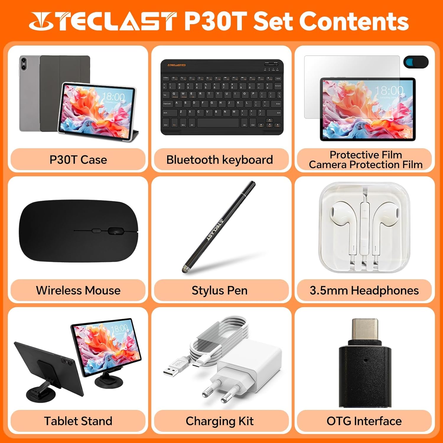 🌳【Multifunzionale Tablet 2 in 1】Il P30T tablet Android 14 è dotato di una ricca dotazione di accessori, che lo rendono un regalo perfetto per amici e familiari. Elenco accessori: tablet, tastiera Bluetooth, mouse wireless, custodia protettiva, supporto per tablet, cuffie, caricabatterie, cavo di ricarica Type-C, penna touch, adattatore OTG, pellicola protettiva, perno di espulsione della scheda SD, manuale.