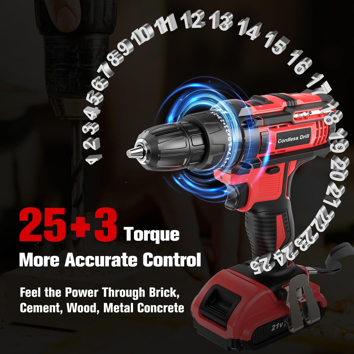 Trapano Avvitatore Batteria 21V, Avvitatore a Batteria con 2 Batterie da 2.0Ah, 42N.m di Coppia, 2 Velocità, 25+3 Coppia, 30 Accessori, Luce a LED, Per il fai da te