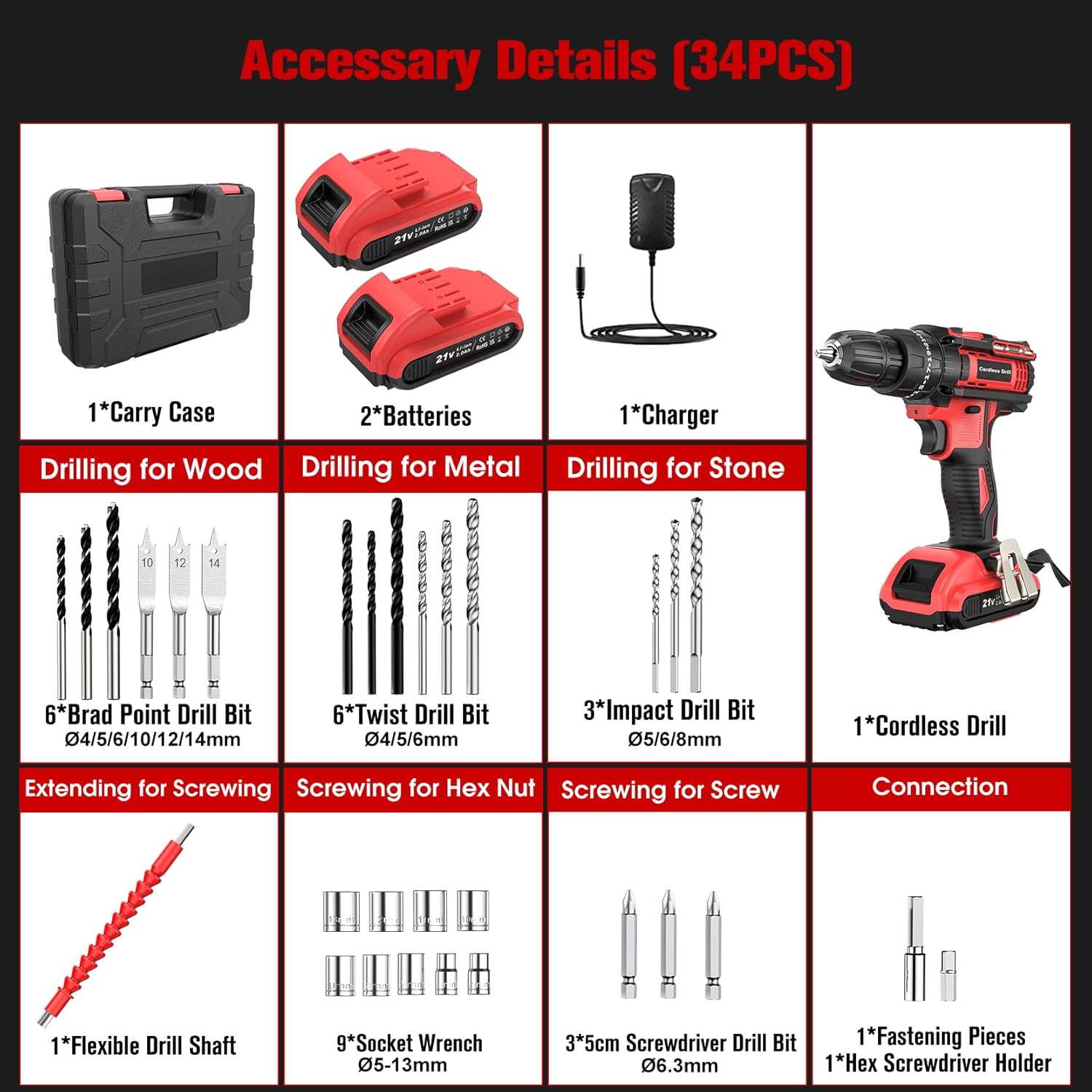 【30PCS Accessori e Applicazioni Estese】 Il trapano elettrico viene fornito con trapano a batteria * 1, batteria da 2,0 Ah * 2, caricabatterie * 1, custodia per il trasporto * 1, manuale utente * 1, punta per trapano Brad Point * 6, punta elicoidale * 6, Punta per trapano a percussione * 3, punte per cacciavite * 3, albero flessibile per trapano * 1, chiave a tubo * 9, punta di fissaggio * 1, supporto per cacciavite esagonale * 1, clip da cintura * 1 inclusa.