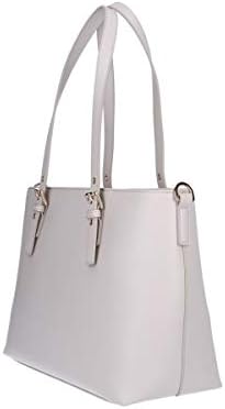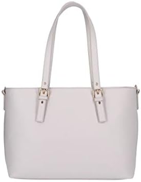 Shopping in saffiano di colore cuoio e logo in oro chiaro, come tutta la metalleria. Internamente in vellutino, presenta un taschino con zip. Chiusura con cerniera e accessoriata di tracolla e pendente. Dimensioni: 23x24x14 cm. Altezza manici 23 cm.