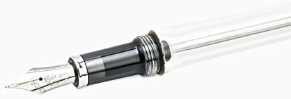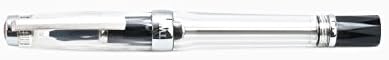 La penna stilografica Twsbi Vac700R prende il nome dal suo sistema di caricamento: Vacuum Filler (a siringa rovesciata) ed è la più grande stilografica da loro prodotta con un meraviglioso pennino di dimensioni estetiche abbondanti (misura #6). Con corpo in resina completamente trasparente e finiture “smoke” si tratta di una penna capace di caricare fino a 2.37 ml di inchiostro, colorandosi del suo colore. Il cappuccio presenta una clip in metallo satinato. Il sistema di caricamento Vacuum Filler funziona in questo modo: svita il fondello della penna, tira il pistone verso l’esterno fino a fine corsa, inserisci il pennino nell’inchiostro e spingi il pistone verso la punta della stilografica. Quando riavviti il fondello, una guarnizione chiude il blocco scrittura. Tutto questo permette di avere piena sicurezza nel trasporto della penna stilografica in qualsiasi condizione, anche in aereo! Per scrivere si hanno due soluzioni: utilizzare l’ inchiostro presente nel gruppo scrittura oppure lasciare il fondello della stilografica semi-aperto. La versione VAC700R è un aggiornamento 2017 al suo primo modello. Mentre prima si avevano due guarnizioni (uno di ricarica ed uno per bloccare il gruppo scrittura) ora questa è unica e svolge entrambi le funzioni. Il flusso di inchiostro è stato migliorato e la capacità del gruppo scrittura è stata aumentata. Il pennino in acciaio è disponibile nelle gradazioni di scrittura: EF (ExtraFine) F (Fine) M (Medium) B (Broad) Italic 1-1 Nella confezione in plastica con scatola in cartone è presente la penna stilografica e tutto l’ occorrente per smontarla e lubrificarla. SCHEDA TECNICA: Materiale: Policarbonato Pennino: Acciaio Sistema di caricamento: Siringa rovesciata (vacuum filler) Confezione: Scatola Misure: Chiusa 147 mm; corpo penna 134 mm; con cappuccio calzato 175 mm Diametro: 15 mm Peso: 32 g
