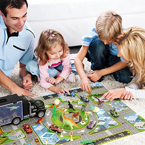 【Camion giocattolo con portaoggetti】 Entrambi i lati del camion hanno coperchi che possono essere chiusi e aperti, che possono ospitare 12 piccoli dinosauri, 6 macchinine e 10 segnali stradali.