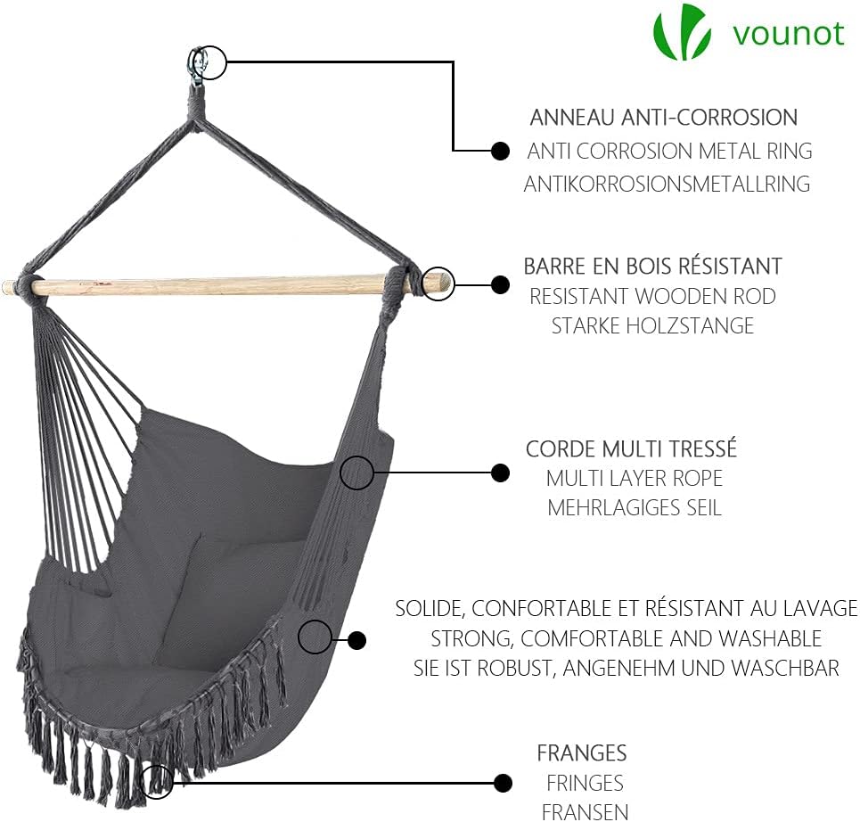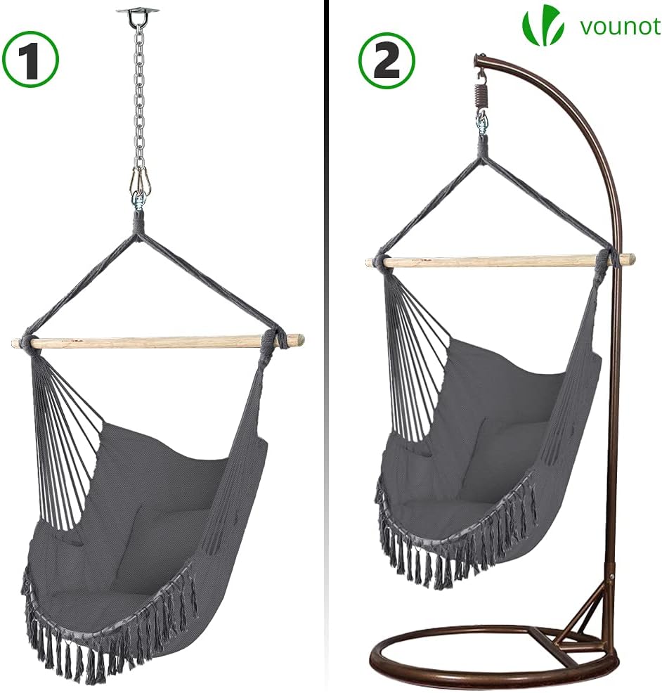 EXTREMELY COMFORTABLE: Made of soft cotton, our hammock swing chair is specially adapted to your body. The two large ergonomic cushions will give you extra support. The soft feeling completely relaxes the body and mind.