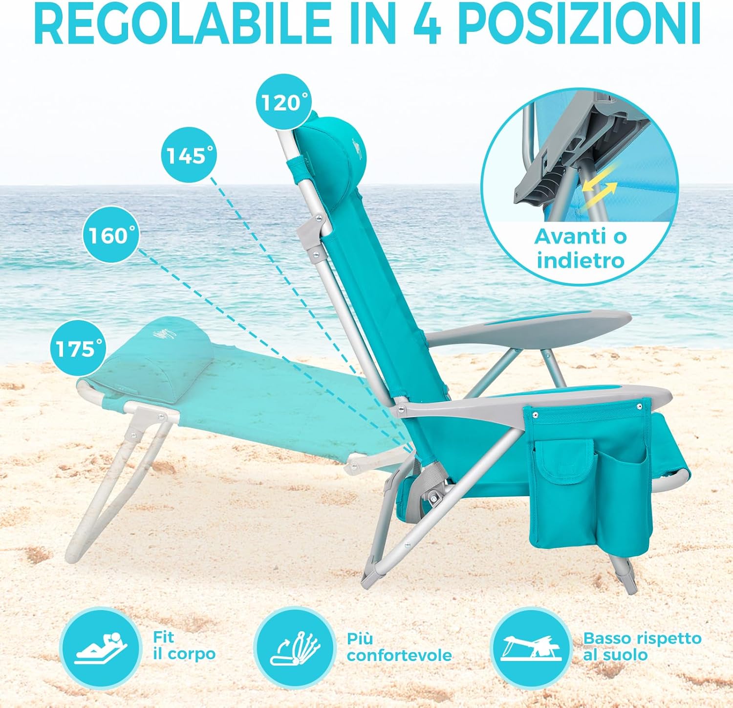 【4 Posizioni Regolabili】La sedia da campeggio pieghevole offre 4 posizioni regolabili, permettendoti di scegliere comodamente tra seduto, reclinato e completamente sdraiato. Quindi questa sedia può essere utilizzata anche come sedia a sdraio. Potrai così trovare la posizione perfetta per il tuo relax in spiaggia, in base alle tue esigenze individuali.