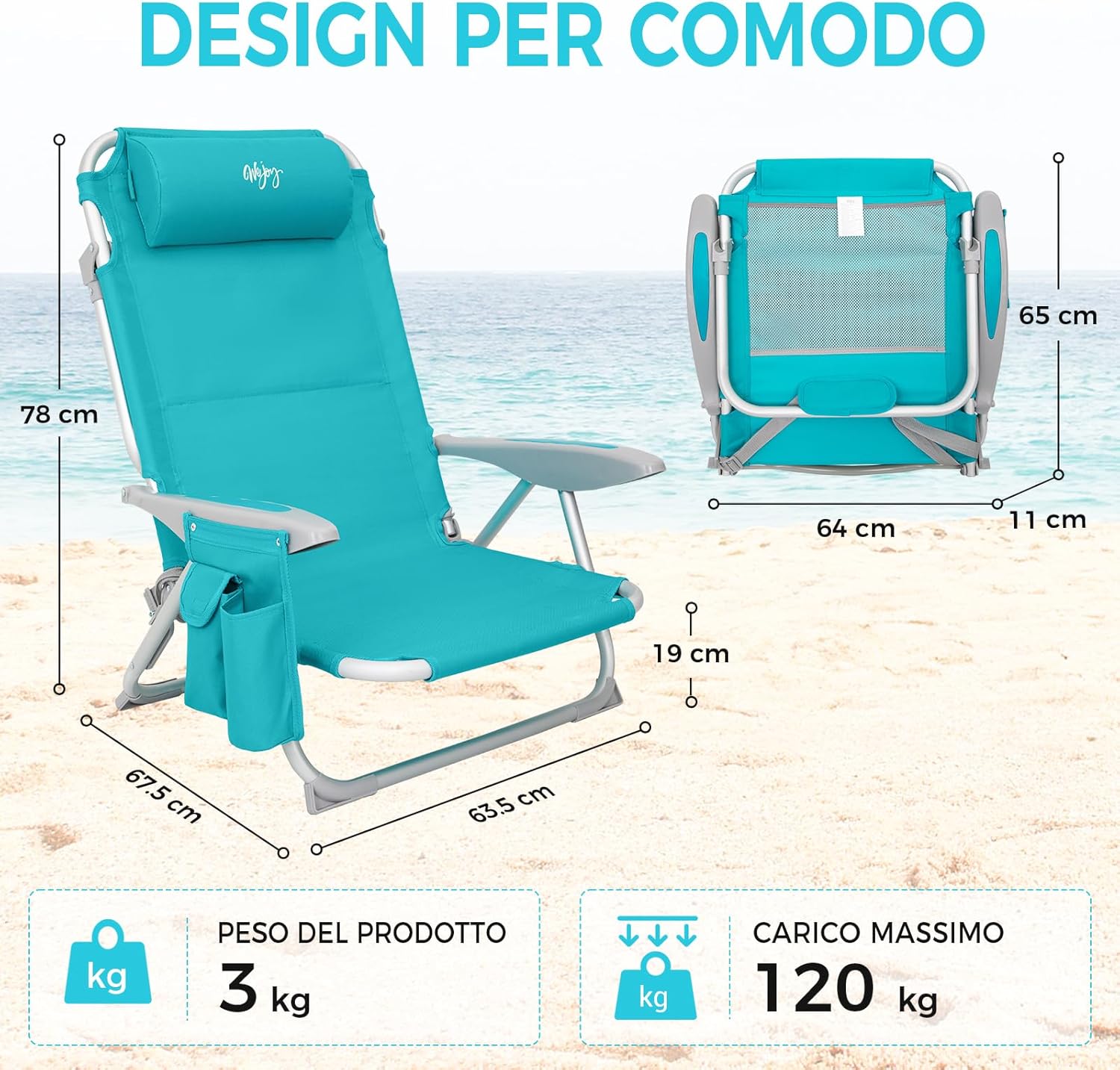 【Design Confortevole】Dotata di un comodo poggiatesta e braccioli rigidi, promette un piacevole bagno di sole. Le tasche laterali permettono di riporre oggetti lasciando le mani completamente libere. Il supporto sul retro della sedia pieghevole non solo sostiene lo schienale quando la sedia è distesa, ma può essere utilizzato anche come portasciugamani quando si è seduti.