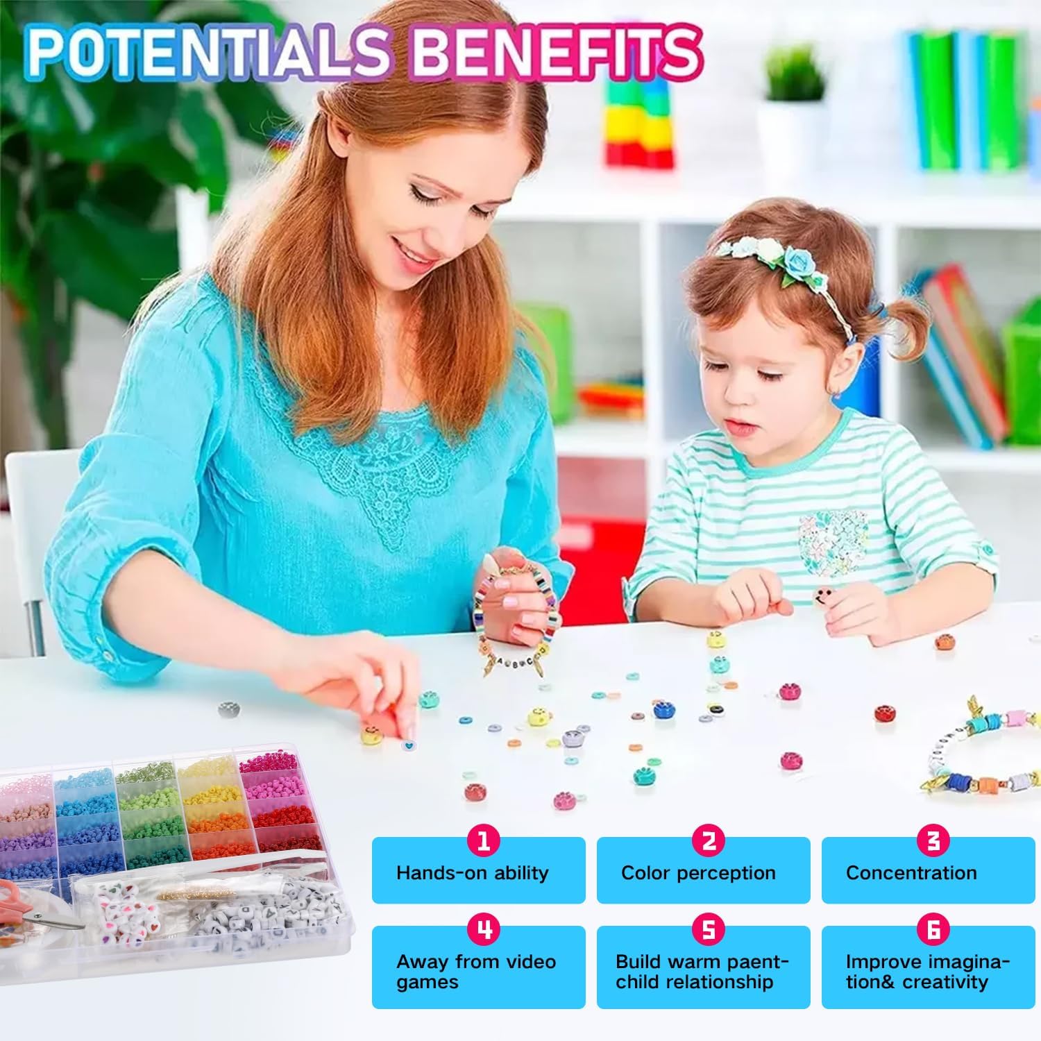 🌈 【Set Completo e Versatile】 Include tutto il necessario per la creazione di braccialetti: 12000 perline in vetro in 24 colori, 20 chiusure a moschettone, 100 anelli di salto, forbici e filo elastico di cristallo. Perfetto per progetti di bigiotteria e decorazioni creative.