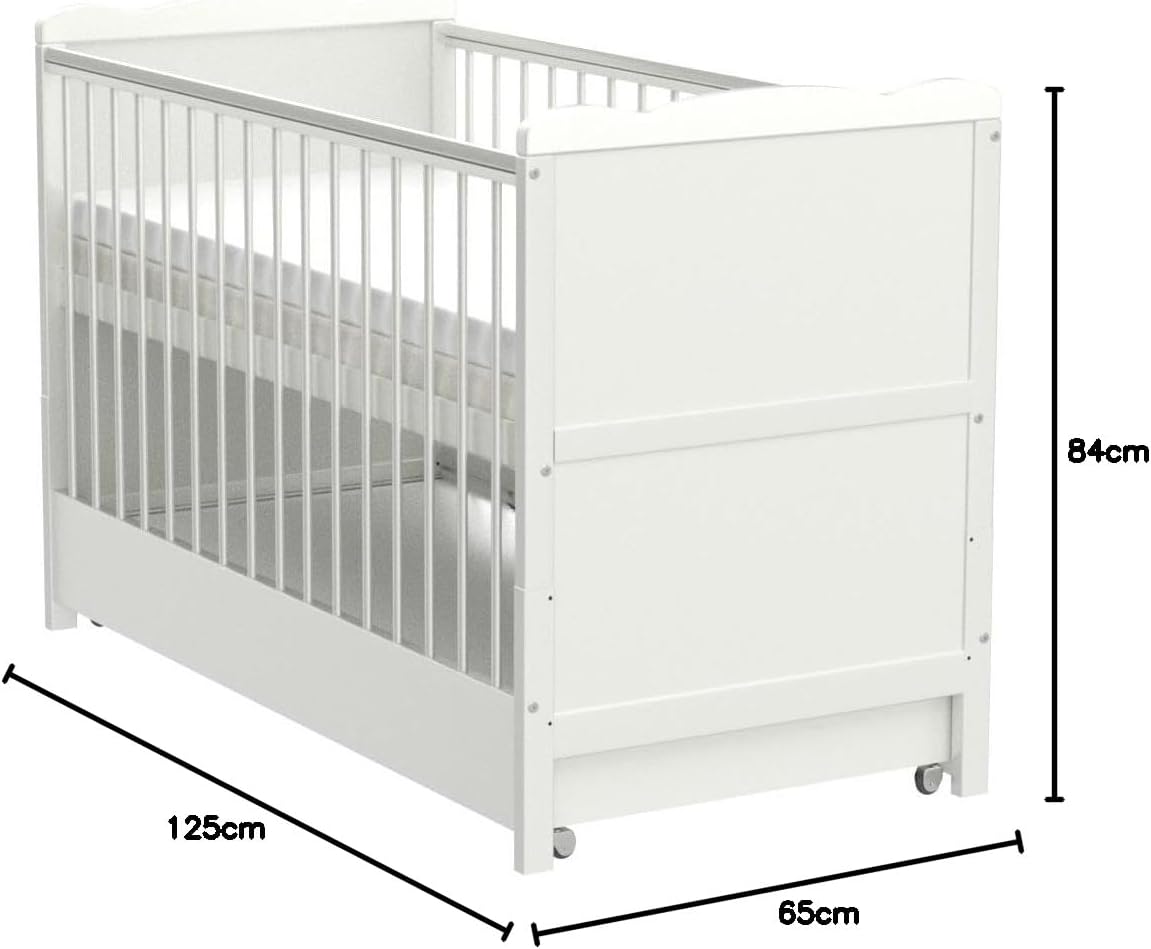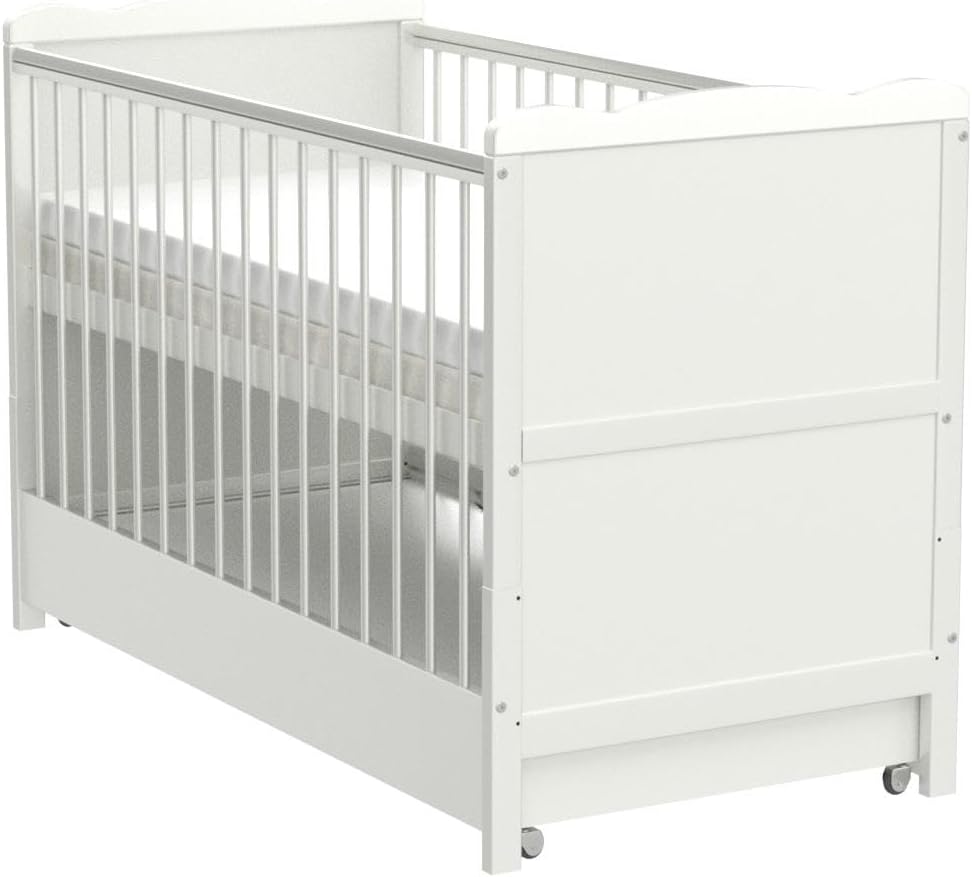 White Wooden Baby Bed with Drawer + Luxury Aloe Vera Mattress + Three Height Positions + Gum Rail