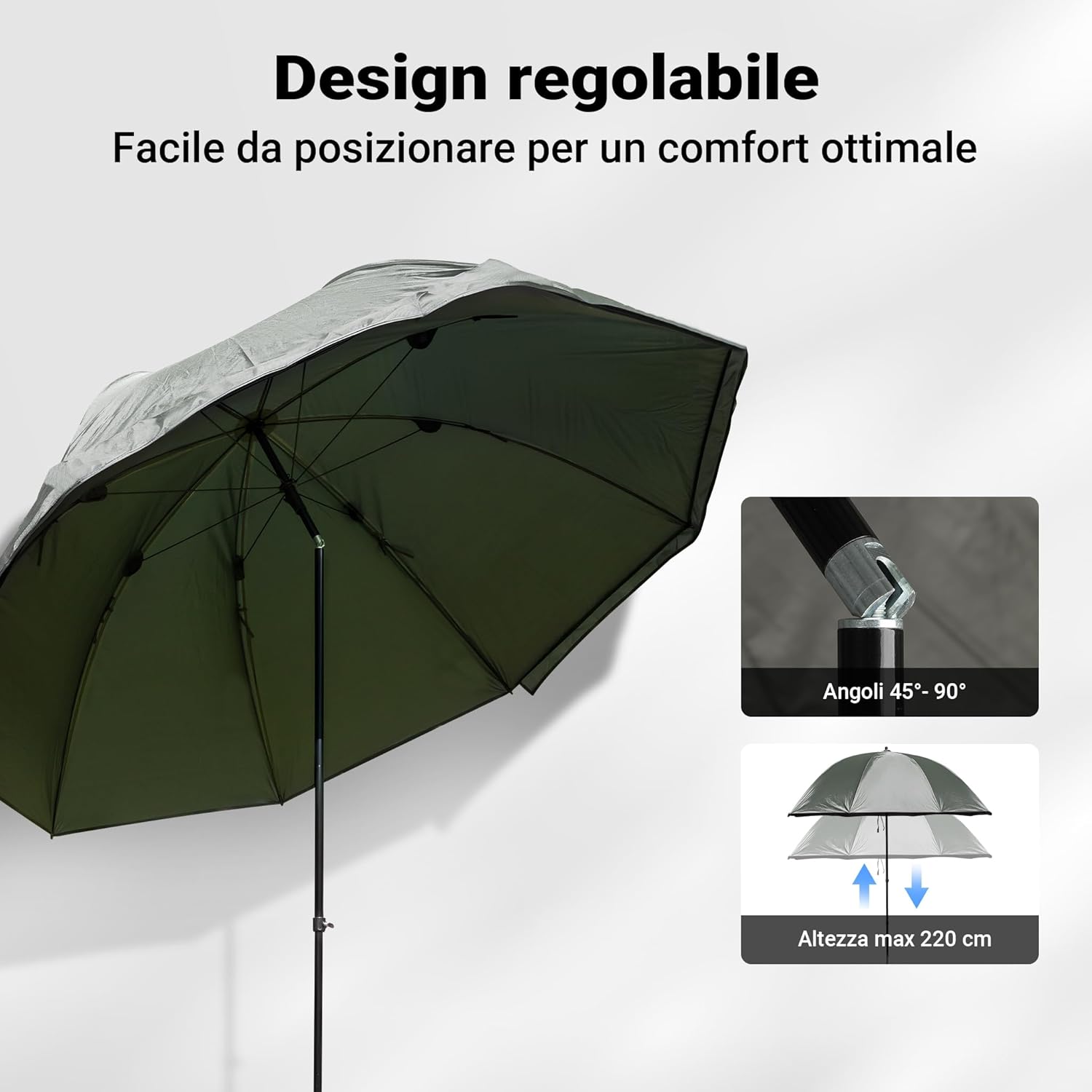 Grazie al design inclinabile, l’ombrellone da pesca si adegua facilmente alle varie esigenze e protegge efficacemente da sole, vento o pioggia.
