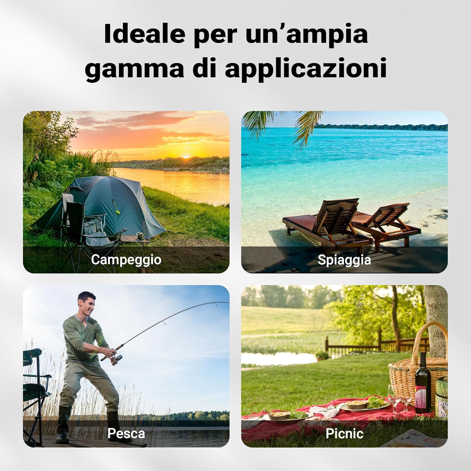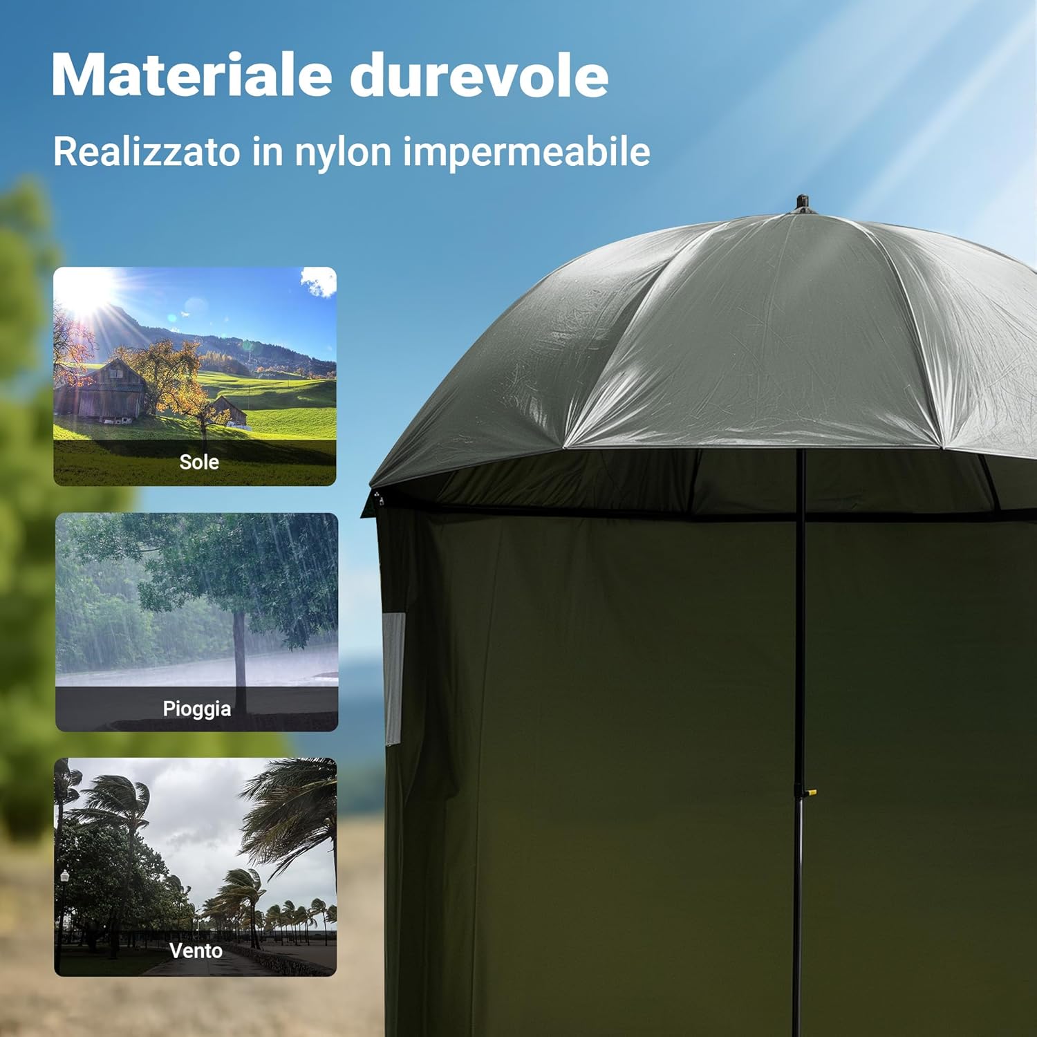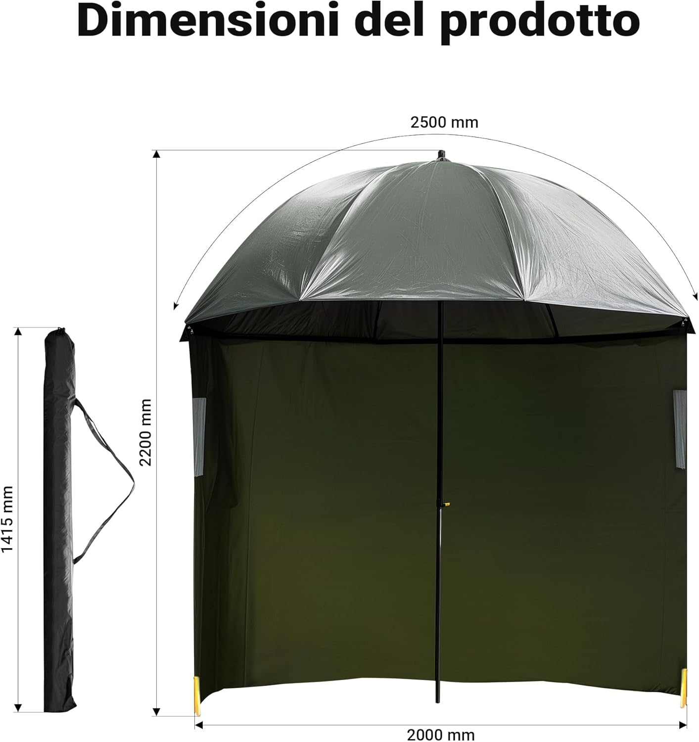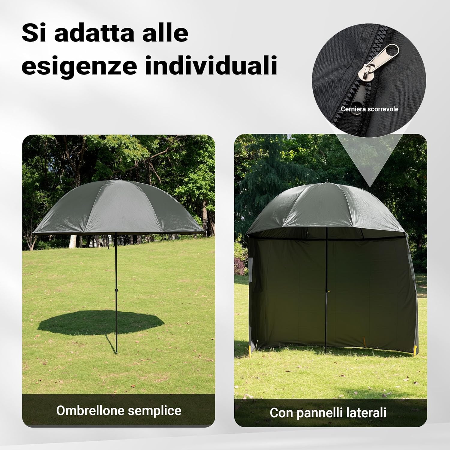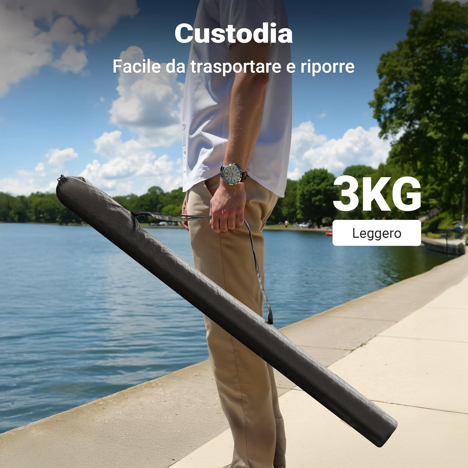 L’ombrellone da pesca viene fornito con una borsa in cui riporlo dopo l’uso che ne facilita il trasporto e lo stoccaggio.