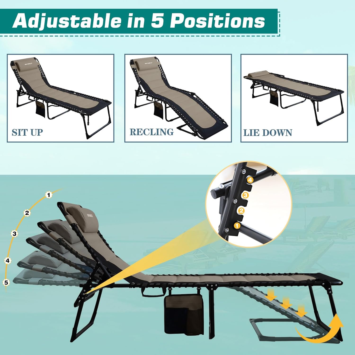 Reclinabile a 5 vie: Lo schienale della poltrona da campeggio può essere regolato in 5 posizioni e l’angolo è da 130° a 180°. Scegli l’attrezzatura giusta in base alle tue esigenze, rilassati e goditi il sole